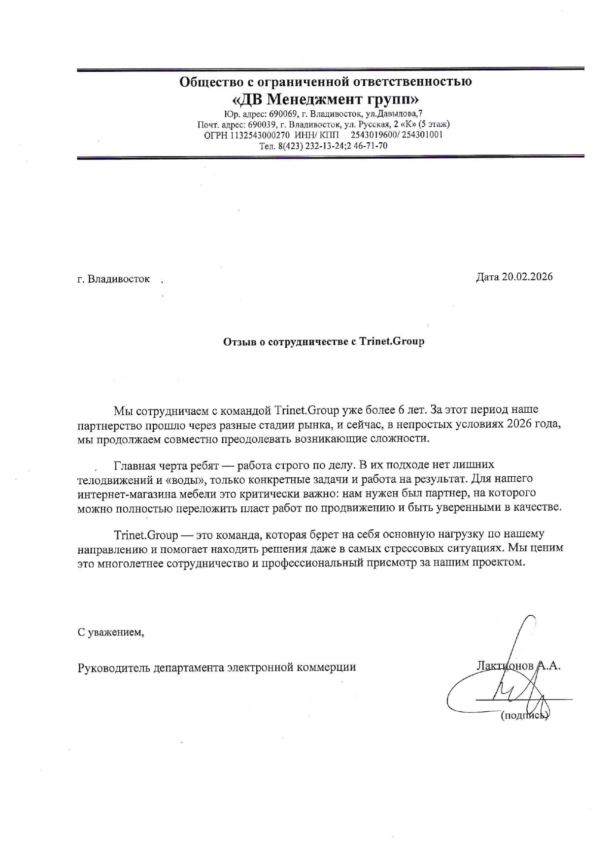 В процессе работы мы не только достигли отличных результатов, но и получили ценные знания в области SEO. Специалисты «TRINET» щедро делились своими рекомендациями и подходами, объясняли тонкости оптимизации и продвижения сайтов, что позволило нам глубже понять процессы и сделать наш сайт еще более эффективным. Этот опыт стал важным вкладом в профессиональное развитие нашей команды, и мы благодарны за поддержку и обучение в ходе всего сотрудничества.