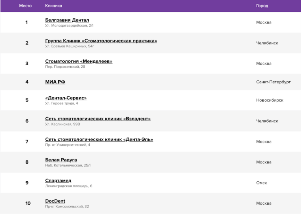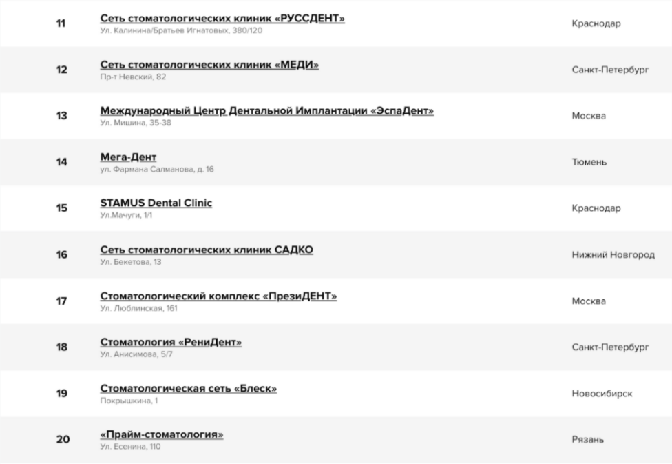 1. Взяли 20 сетевых клиник из рейтинга Startsmile.