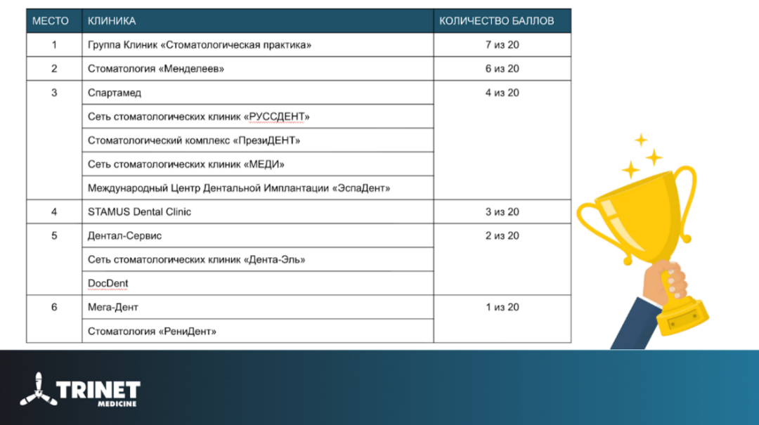 Мы в TRINET.Medicine провели исследование: взяли ТОП-20 крупнейших сетевых стоматологических клиник по версии Startsmile и проверили их сайты по 20 ключевым факторам, которые поисковые системы используют для оценки качества медицинских сайтов. Эти параметры определяют позиции сайта в Google и Яндекс. Ошибки снижают рейтинг и поток пациентов.