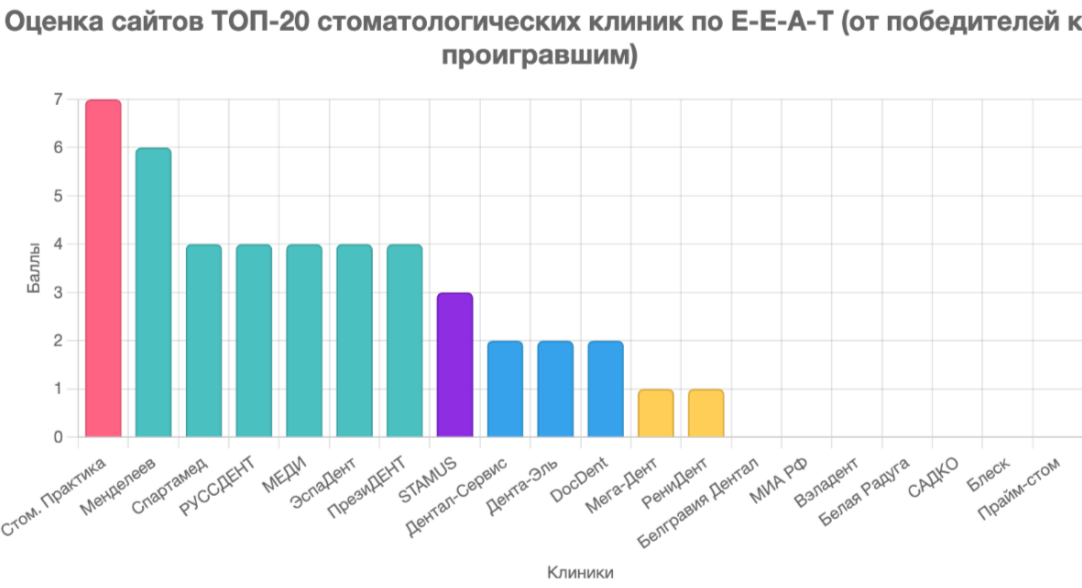 Совместно с моей командой мы провели первый в России подробный аудит сайтов стоматологических сетей по E-E-A-T-факторам.