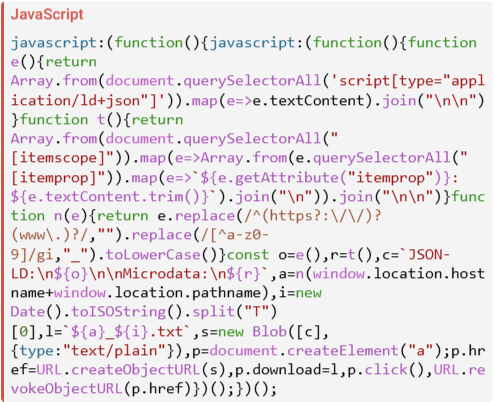 javascript:(function(){javascript:(function(){function e(){return Array.from(document.querySelectorAll('script[type="application/ld+json"]')).map(e=>e.textContent).join("\n\n")}function t(){return Array.from(document.querySelectorAll("[itemscope]")).map(e=>Array.from(e.querySelectorAll("[itemprop]")).map(e=>`${e.getAttribute("itemprop")}: ${e.textContent.trim()}`).join("\n")).join("\n\n")}function n(e){return e.replace(/^(https?:\/\/)?(www\.)?/,"").replace(/[^a-z0-9]/gi,"_").toLowerCase()}const o=e(),r=t(),c=`JSON-LD:\n${o}\n\nMicrodata:\n${r}`,a=n(window.location.hostname+window.location.pathname),i=new Date().toISOString().split("T")[0],l=`${a}_${i}.txt`,s=new Blob([c],{type:"text/plain"}),p=document.createElement("a");p.href=URL.createObjectURL(s),p.download=l,p.click(),URL.revokeObjectURL(p.href)})();})()
