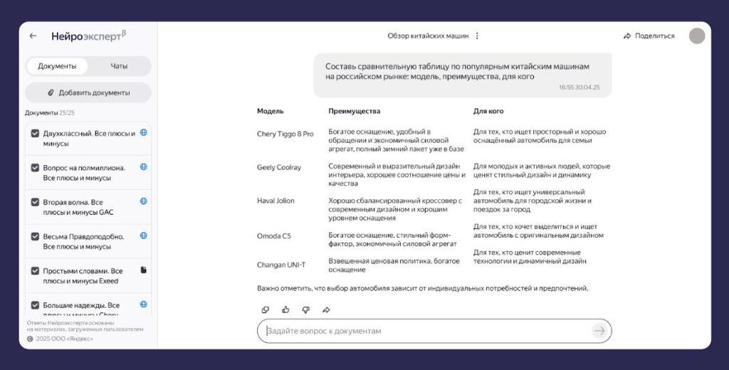 Пользователи могут загружать документы, таблицы, презентации, аудио, видео и находить в них ответы на вопросы в режиме диалога. Нейроэксперт также пересказывает тексты, делает выводы, сравнивает данные и пишет тексты в нужном стиле.