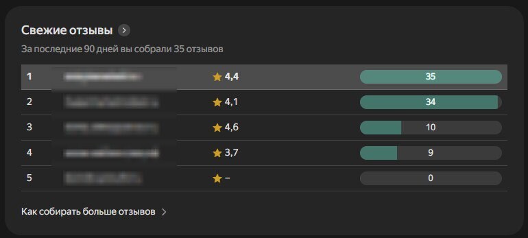 На главной странице проекта в Яндекс Вебмастер стал отображаться блок «Свежие отзывы» в котором можно увидеть свой сайт в сравнении с конкурентами по рейтингу и количеству отзывов за последние 3 месяца (список конкурентов для отслеживания можно редактировать).