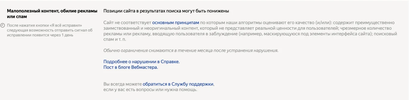 Причина Что проверяли Результат проверки Неоригинальный контент Оригинальность текстов более 80% ✅ В контенте нет пользы Качество и экспертность текстов ✅ Чрезмерное количество рекламы Наличие рекламных блоков на страницах ✅ Переоптимизация страниц SEO-параметры текстов ✅ Наличие SEO-ссылок на страницах Внутренние и внешние ссылки ✅ Автоматические редиректы на страницах, перенаправляющие пользователя на сторонние ресурсы Наличие редиректов ✅ Наш вывод – фильтр был дан по ошибке. В таком случае помогает только прямое общение с технической поддержкой Яндекса.